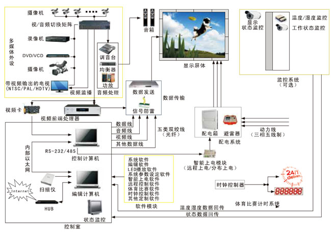 體育場館的專業(yè)性及其使用環(huán)境決定了LED顯示屏的框架結(jié)構(gòu)設(shè)計和電路結(jié)構(gòu)設(shè)計與其他顯示屏不同,同時,由于體育場館LED顯示屏的使用頻率相對不高,一旦使用,必定是觀眾聚集,出現(xiàn)任何故障都會帶來負面影響,因此其質(zhì)量要求更高,使用和維護必須簡便,電路結(jié)構(gòu)設(shè)計應(yīng)當能夠讓用戶在現(xiàn)場及時排除臨時的故障。因此,學校體育場館顯示屏的功能比其他場所的顯示屏要求更高,文字、動畫、視頻圖像僅僅是基本功能,系統(tǒng)功能軟件應(yīng)涵蓋能夠舉辦的所有體育比賽項目的計時、記分等比賽信息的發(fā)布,以及集會中的文字、圖像顯示功能。