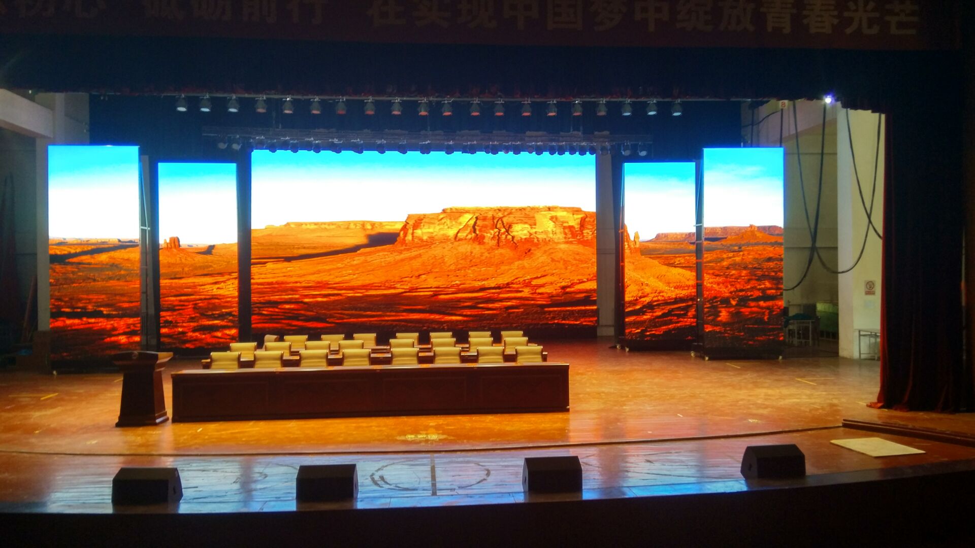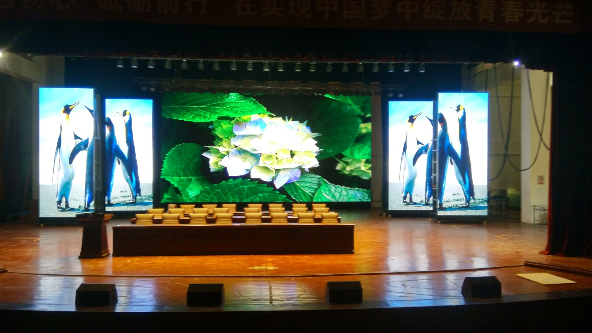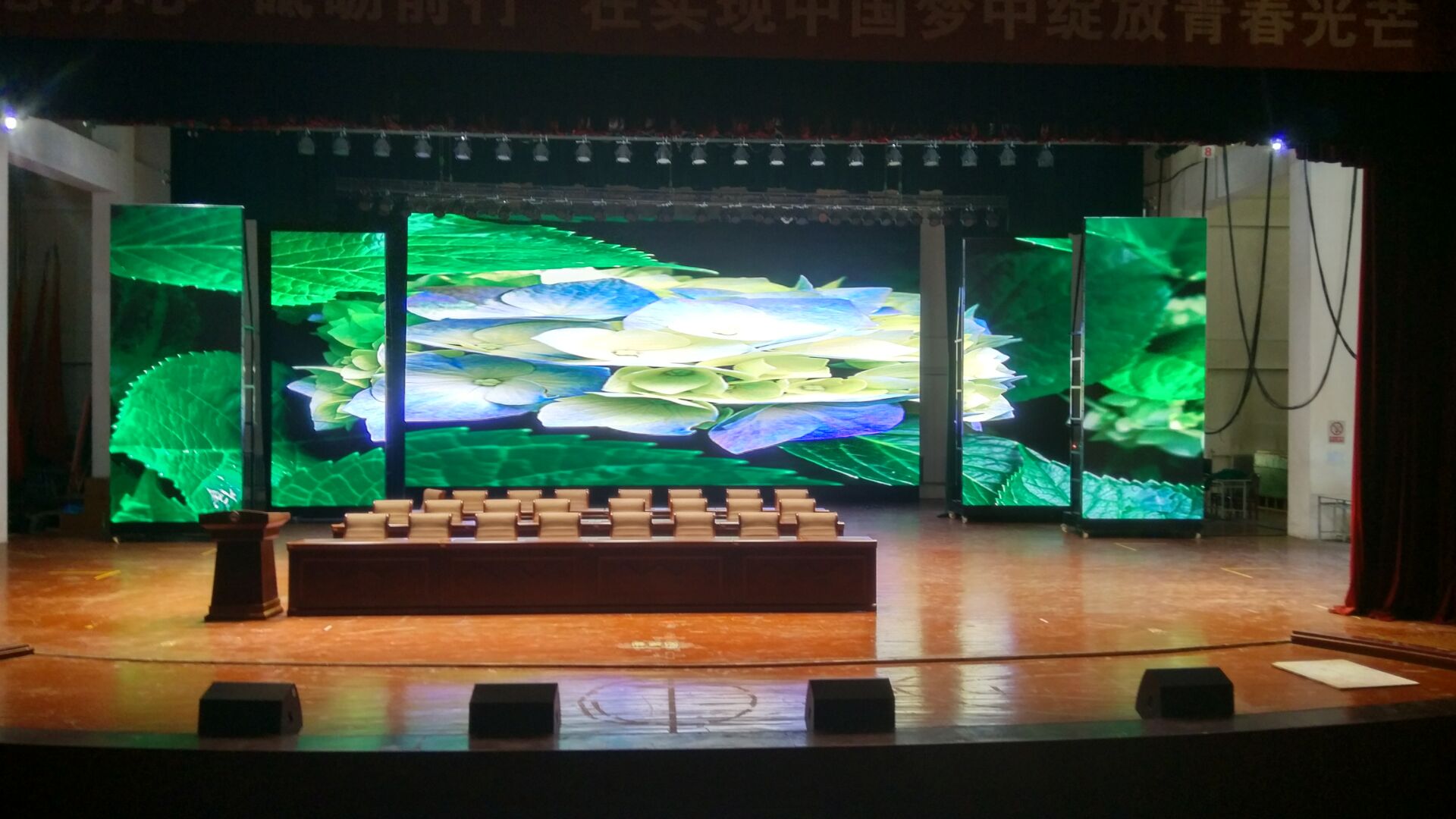本項(xiàng)目佳惠科技為某學(xué)院舞臺(tái)區(qū)量身打造的戶內(nèi)全彩LED顯示屏,屏幕整體分為主屏和側(cè)屏兩個(gè)部分。主屏幕可用來播放動(dòng)畫與實(shí)時(shí)視頻,與舞臺(tái)兩側(cè)華麗側(cè)屏交相輝映,打造美輪美奐的視覺效果。佳惠戶內(nèi)全彩LED顯示屏色彩細(xì)膩豐富、色彩還原性好、畫面自然逼真,點(diǎn)亮后鮮艷的色彩鋪灑開來,猶如一幅幅美妙的畫卷,讓人陶醉。