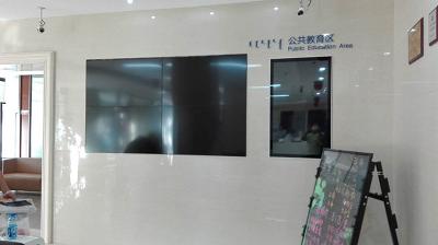 營業(yè)大廳另一側(cè)的形象展示墻,超窄邊液晶拼接屏高清播放著銀行特色產(chǎn)品。